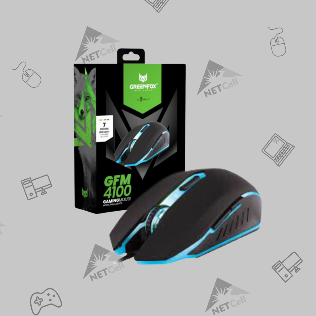 Mouse gamer Greenfox GFM4100 con sensor óptico preciso, DPI ajustable, diseño ergonómico y LED multicolor, perfecto para partidas rápidas y cómodas.